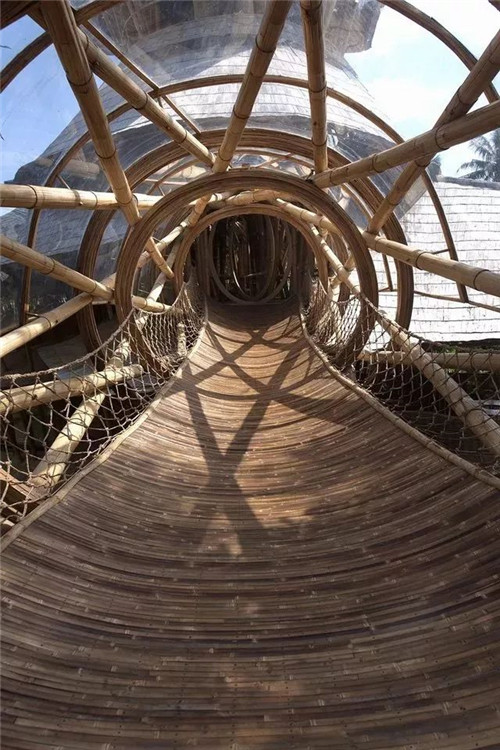 別墅的入口經(jīng)過一個非常具有戲劇性的隧道連橋,之后直接進(jìn)入到露天起居室及餐廳。戲劇性的空間讓它可以稱得上為一座奇幻主題樂園。